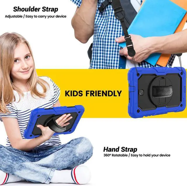 Three Parts: Top PC Frame with built-in screen protector Inner PC bumper lining Soft silicone outer shell Provide all round protection for your tablet. 360 Degree Rotating Kickstand Rotating & Steady stand frees your hands. Rotatable & Adjustable Hand Strap The hand strap can be adjusted with the tightness you like, whether you're an adult or a child. Adjustable & Removable Shoulder Strap With the adjustable and removable shoulder strap, it's convenient when you on a business trip, hiking or any other occasion when you need it. It can be also hung on the car headrest for back-seat passengers' entertainment. Ideal for kids, students. Drop Resistance This t387 case will protect your tablet from dropping, shocking and scratching. Do not need to worry about accidental drop.