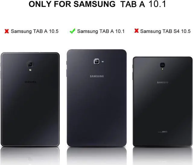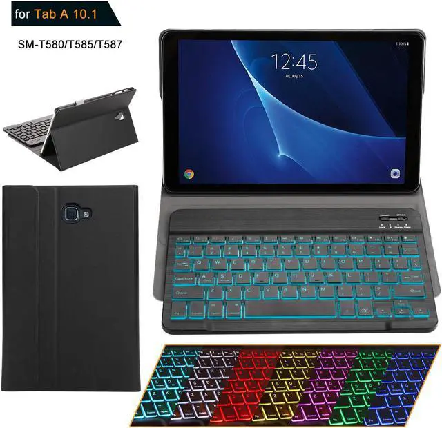 Highlights: Stylish Tablet Keyboard Case --- This keyboard case is applied for Samsung Galaxy Tab A 10.1 No S Pen SM-T580/T585/T587 Tablet, it is Not compatible with Samsung Galaxy Tab A 10.1 with S Pen(SM-P580/P585) and any other model device. Please kindly check before purchase. Bright Backlit Keyboard --- 2 Mode of backlight display (Scroll through RGB colors or just constant RGB color) ) and 7 vibrant colors make typing fun and easy in the dark or the light, and its island style keys are quiet and comfortable. The Folio comes in black, rosegold and gold colors; multiple choices give you the freedom to choose what you like. Smooth Keyboard --- The Scissor-Switch BT keyboard provides you with very comfortable, pleasing typing experience and makes little noise. Our unique scissor-switch technology makes sure that even the softest keystrokes are sufficient to relieve any unnecessary pressure while typing. Multi-Angel Stand Cover & Precise Cutouts --- The three viewing angle is easy to adjust to any comfortable angle you want, suitable for working, writing, or watching videos at work, school, travel, and home. Full access to all features (such as cameras, speaker, ports and buttons).