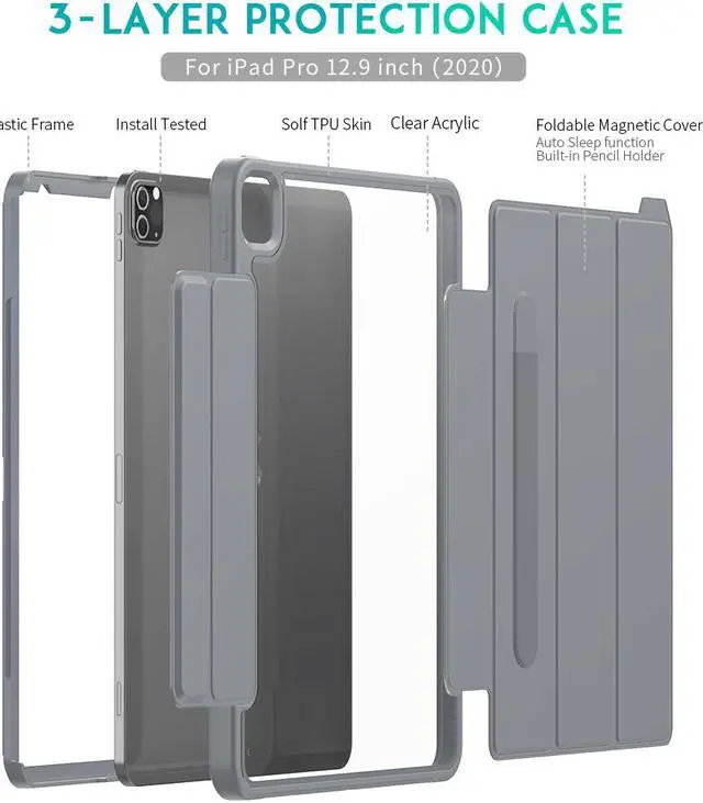 (Pencil is Not included) [Superb Protection]: the iPad Pro 12.9 2020 2018 case combines 3-layer total front-and-back protection, quality magnetic PU leather front cover, sturdy hard polycarbonate lining and Hard Acrylic back cover offering superior protection for your iPad against accidental drops, scratches, bumps and dust.