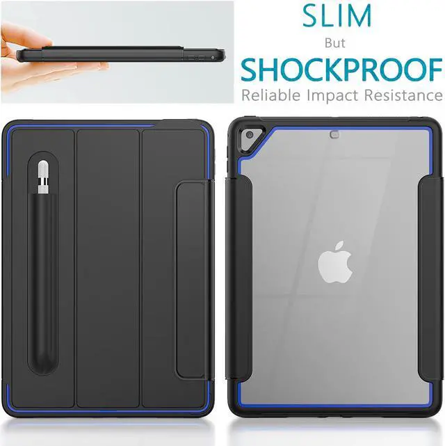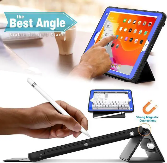 Tri-fold Stand Function: The removable magnetic front cover can be folded into a triangle as a kickstand to prop your iPad up in two standing positions, always giving you comfortable hands-free angles for movie-viewing, typing, reading or face-to-face chatting with friends for any situation, anywhere in your home, office or outside. Convenient Pencil Holder & Precise Cutout: This iPad case is featured by an extra stylus holder. Easily plug in/out, making the pencil always at your hand whenever you need it. Precise cutout allows full access to all the buttons, ports or features without removing the case. Well-designed dust cover for each port prevents dust getting in.