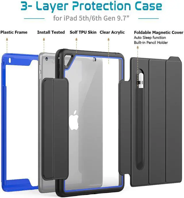 (Pencil is Not included) [Superb Protection]: the New iPad 9.7 Inch 2017/2018 case combines 3-layer total front-and-back protection, quality magnetic PU leather front cover, sturdy hard polycarbonate lining and Hard Acrylic back cover offering superior protection for your iPad against accidental drops, scratches, bumps and dust.