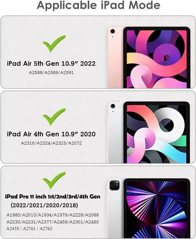 [Compatibility] Designed exclusively compatible with iPad Pro 11 inch 4th Gen 2022(Mdoel: A2435 / A2761 / A2762), iPad Pro 11 inch 2021 3rd generation (model: A2301, A2377, A2459, A2460), iPad Pro 11 2020 2nd generation (model: A2228 / A2068 / A2230 / A2231), iPad Pro 11 2018 1st generation (Model: A1980 / A2013 / A1934 / A1979), iPad Air 4 10.9 inch 2020 4th generation (Model: A2072 / A2316 / A2324 / A2325),iPad Air 5 10.9 inch 2022 5th generation (Model Number:A2588 /A2589/A2591). Please check the model number before purchasing.