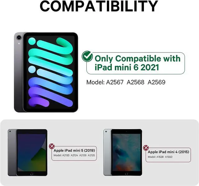 Compatible Models --- Designed for iPad Mini 6 2021 8.3 inch (Model: A2567/A2568/A2569). It is not compatible with any other devices size. Please check the iPad model number of the back bottom before purchasing.