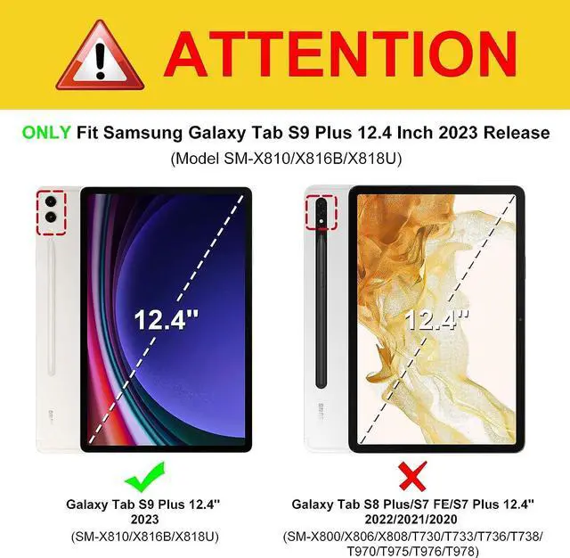 Compatibility: Only Fit for Samsung Galaxy Tab S9 Plus 12.4 inch 2023 Model: SM-X810 / SM-X816B / SM-X818U. It is Not fit to any other devices. Please kindly check the model number in the settings before purchase.