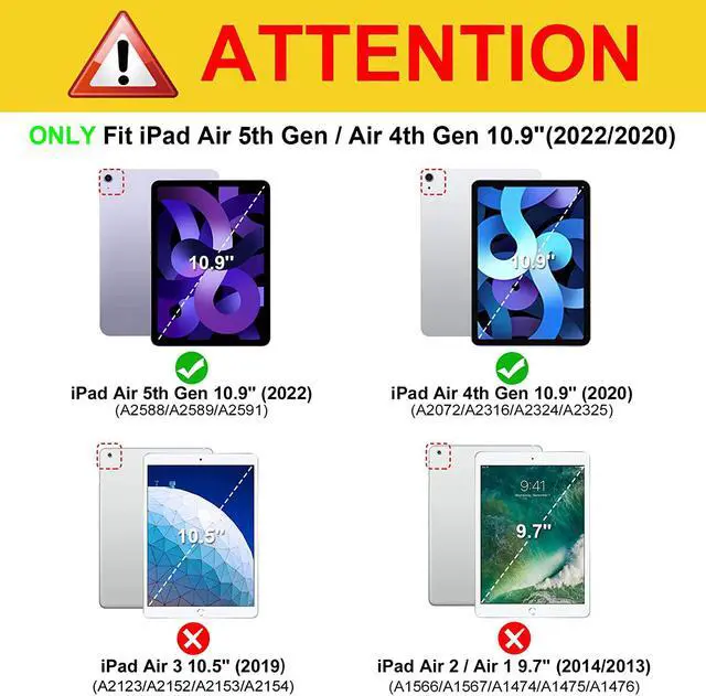 Compatible Models --- Designed for Apple iPad Air 5 10.9 Inch 2022 (5th Generation) (Model Number:A2588/A2589/ A2591) / iPad Air 4 10.9 Inch 2020 (4th Generation) (Model Number:A2072/A2316/A2324/A2325). Please Note: It doesn't fit for any other tablet models.