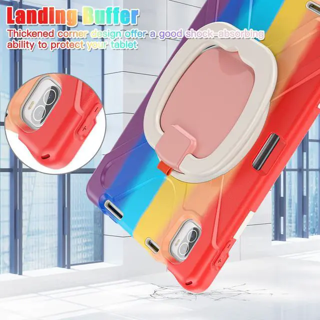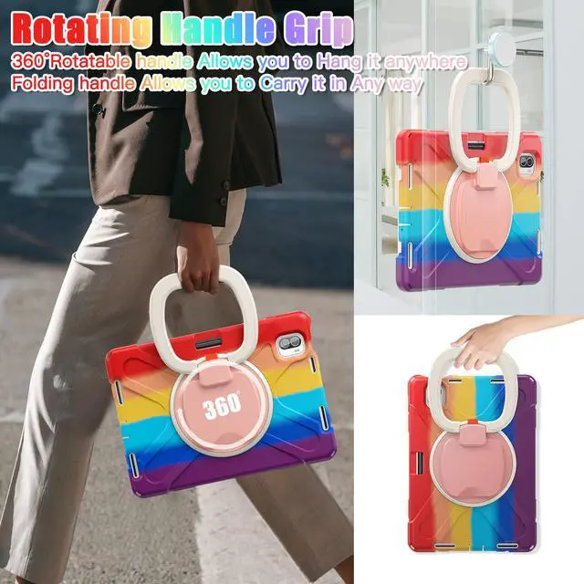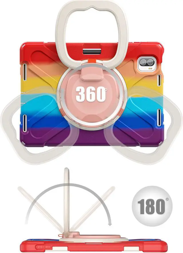 • 360° Swiveling Stand & Hand Strap: Located on the back of shockproof case, built-in 360 degree rotating kickstand and adjustable handle hand strap provides a more flexible and convenient way to use your tablet during work, study or journey, ideal for students,teachers,engineers,cashiers and waiters,etc.