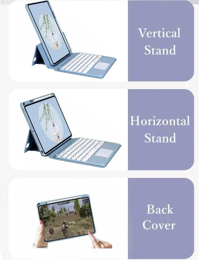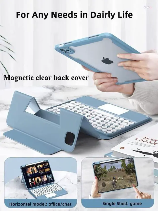 Vertical & Horizontal kickstand & Magnetic separation type back cover : You can put your iPad vertically or horizontally, More angles to meet your needs.When you dont need to use the keyboard, You can use the transparent back cover alone, or use the back cover and leather case alone, which is light and convenient.