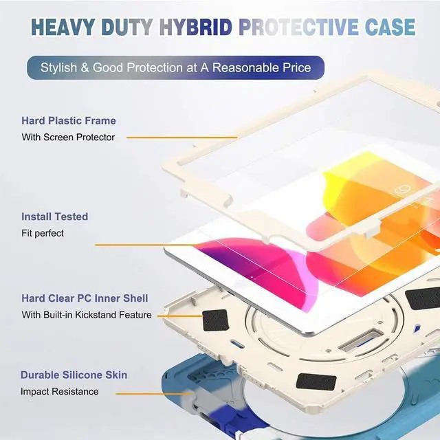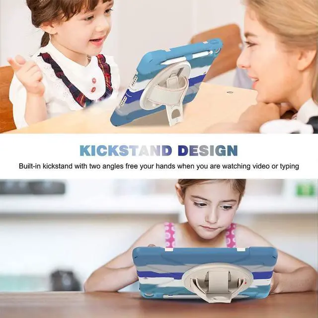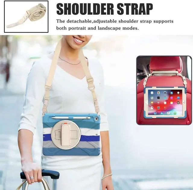 FEATURES: 1- Built-in Kickstand is 360 degree rotating, you can adjust your 10.2 inch iPad to whatever angle you want, perfect for watching videos and chatting; 2- Built-in elastic Pencil Holder makes it easy to pull out and store your Apple pencil store your Apple Pencil 3- Adjustable velcor hand strap allows big hand and small hand, perfect for kids and adults. 4- Adjustable and detachable Shoulder belt is very convenience, safe and fashion you can carry tablet with should belt wherever you want