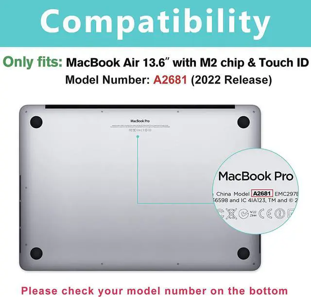 Designed ONLY to be compatible with MacBook Air 13.6 inch M2 Chip with Liquid Retina Display & Touch ID 2022 Release (model: A2681 - MLXW3LL/A, MLXX3LL/A, MLXY3LL/A, MLY03LL/A, MLY13LL/A, MLY23LL/A, MLY33LL/A, MLY43LL/A). WARNING: This case is NOT compatible with other model laptops.