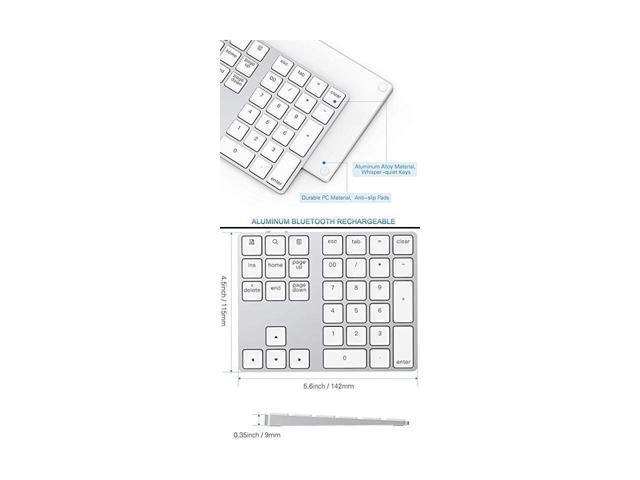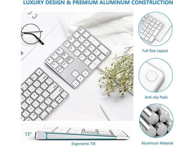 This Aluminum Bluetooth number pad features solid aluminum coating and ergonomic tilt design, compact Apple-style pad perfectly match your apple magic keyboard and bluetooth devices.