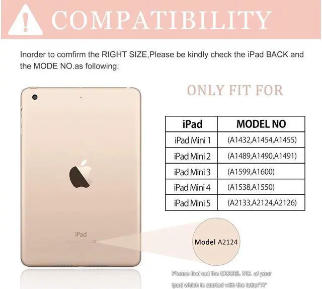 Compatible Models: Designed for iPad Mini 5 (Model Number: A2133,A2124,A2126), iPad Mini 4(Model Number:A1538,A1550) iPad Mini 3 (Model Number:A1599,A1600), iPad Mini 2(Model Number:A1489,A1490,A1491), iPad Mini 1(Model Number:A1432,A1454,A1455). Please Note: It doesn't fit for any other tablet models.