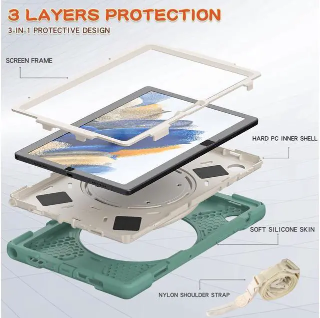 Full Body Protection: 3-layer shockproof heavy duty rugged protection case for tablet combined with 1-layer soft silicone & 2-layer hard polycarbonate front frame and back cover, providing perfect protection for your Galaxy Tab A8 10.5 inch 2022 tablet against accidental drops, scratches, shocks and dust.