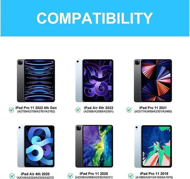 Pro 11 inch 2018 (Model: A1980/A2013/A1934/A1979), iPad Air 5th generation 10.9 inch 2022(Model: A2588/A2589/A2591), iPad Air 4th generation 10.9 inch 2020 (Model: A2072/A2316/A2324/A2325). Please be kindly check your iPad back model before purchasing.