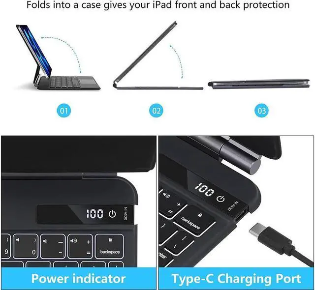[Smart Features] - The vegan leather cover folding as a Protective shell to prevent bumps and scratches, ensures your iPad stays safe. Fluidly and accurately typing on illuminated keys of iPad Pro 11 keyboard, comfortably fit the shape of your fingertips. Support Apple Pencil Wireless Charging. Power display screen can let you know the remaining power of your keyboard.