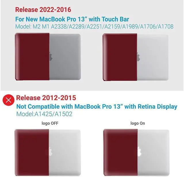 Please kindly check the model number "Axxxx" on the back of the laptop before purchase, make sure you choose the exact same model number as the listing title stated "A2338" or "A2289" or "A2251" or "A2159" or "A1989" or "A1706" or "A1708". Case dimension: 12 x 8.5 x 0.6 inch, compatible with MacBook Pro 13 inch with/without Touch Bar and Touch ID dimension: 11.97 x 8.36 x 0.59 inch (2016 2017 2018 2019 2020 2021 2022 Release). NO Cut Out design, transparency is different from color to color.