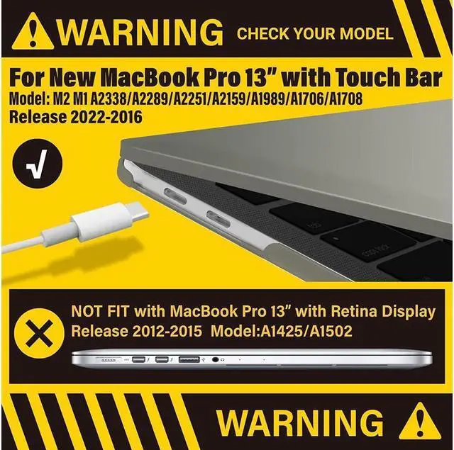 Compatibility: - Case for 2022-2016 New MacBook Pro 13 inch (Models: M2 / M1 / A2338 / A2289 / A2251 / A2159 / A1989 / A1706 / A1708) -- Release in 2022 2021 2020 2019 2018 2017 2016 --- MUHN2LL/A, MUHQ2LL/A, MUHP2LL/A, MUHR2LL/A, MV962LL/A, MV992LL/A, MV972LL/A, MV9A2LL/A -- MR9Q2LL/A, MR9R2LL/A -- MPXV2LL/A, MPXX2LL/A, MPXW2LL/A, MPXY2LL/A, MPXQ2LL/A, MPXR2LL/A, MPXT2LL/A, MPXU2LL/A -- MLL42LL/A, MLUQ2LL/A, MLH12LL/A, MLVP2LL/A, MNQF2LL/A, MNQG2LL/A. Please double check your MacBook's model number "A1xxx" on the bottom of the laptop.