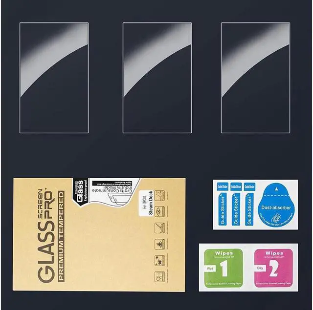 PACKING LIST --- 3 Pack ( 3 x Steam Deck Screen Protector, 1 x Wet Wipes + Dry Wipes, 2 x Guide Stickers, 1 x Dust-absorber, 1 x Gift Box with Instructions.