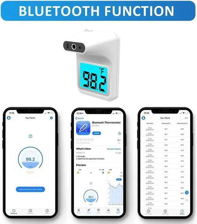BLUETOOTH TECHNOLOGY – This infrared thermometer includes a Bluetooth feature that allows you to connect to our iOS or Android app. The data displayed by the forehead thermometer will be displayed in the software synchronously and automatically saved.