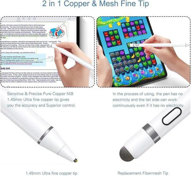 2 in 1 Copper & Mesh Fine Tip --- This stylus pencil has a 1.45mm accurate copper fine point tip end and a magnetic mesh end. Both ends can use. The mesh end also supports the zoom function and allows input in the text box, both used smoothly and sensitively.
