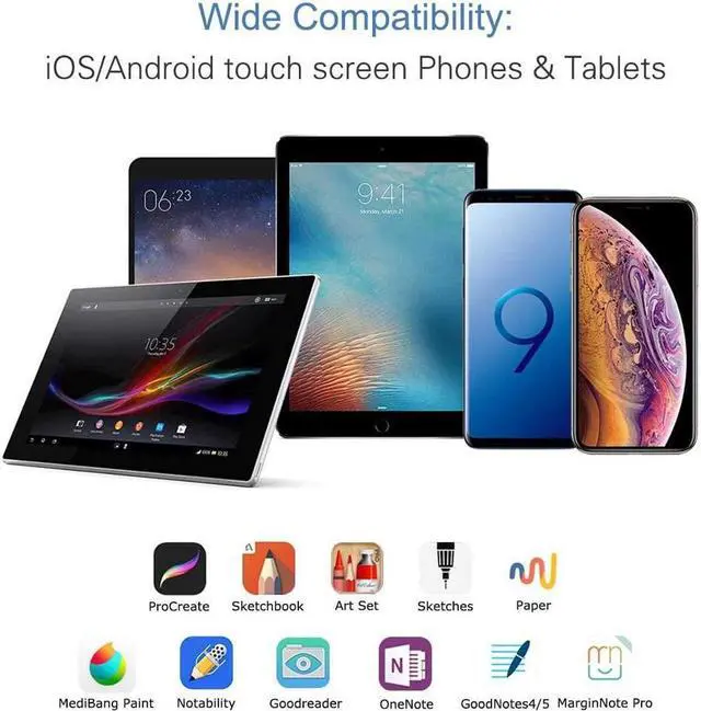 Widely Used --- This iPad stylus pencil is compatible for hand-writing note-taking, drawing and design on an electronic device. Tested on iPhone iPad Pro Smart-Phones Tablets and any capacitance touch screens, all works great! A great alternative for Apple Pencil for artists, journalists, engineers, teachers and students, game players and etc.