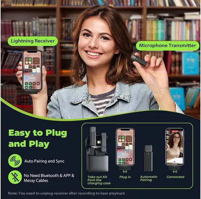 Auto Pairing & Plug-Play --- Get rid of messy cables, the wireless microphone does not need to be connected to Bluetooth, APP and WiFi. Just plug the receiver directly into your device for 1s automatic fast connection. The wireless lightweight design of the mini mic is suitable for daily Vlogs, Amazon/Facebook Live Stream, online course recording, YouTube, interviews, video recording, podcasting and other recording scenes