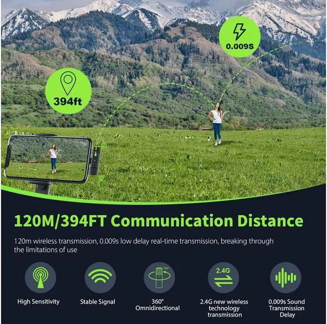 2.4GHz Digital Wireless Transmission Tech --- The wireless lavalier mic system adopts 2.4GHz global wireless frequency transmission technology, which greatly prevents the audio from being interrupted by Bluetooth & Wi-Fi, and achieves 120m/394ft ultra-long anti-interference strong signal transmission. Ideal for YouTubers, Vloggers, Bloggers, Podcasters, Interviewers and content creator to freely record high-quality videos at greater distances