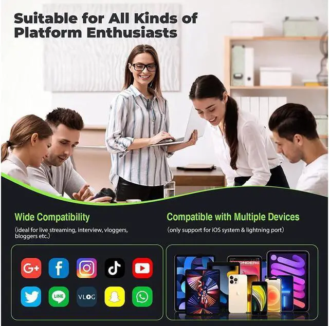 Wide Compatibility Clip-on Microphone --- The wireless lapel microphone is only available for your iPhone 7/ 7 Plus, 8/8 Plus, X/XR/XS/XS Max, 11/11 Pro/11 Pro Max, 12/12 Pro/12 pro Max, 13/13 Pro/ 13 Pro Max and iPad 2/3/4, iPad Air series, iPad Pro series and other lightning interface devices. ****Note: If you want to use the microphone on a USB-C smartphone/iPad, a USB C to Lightning adapter is required