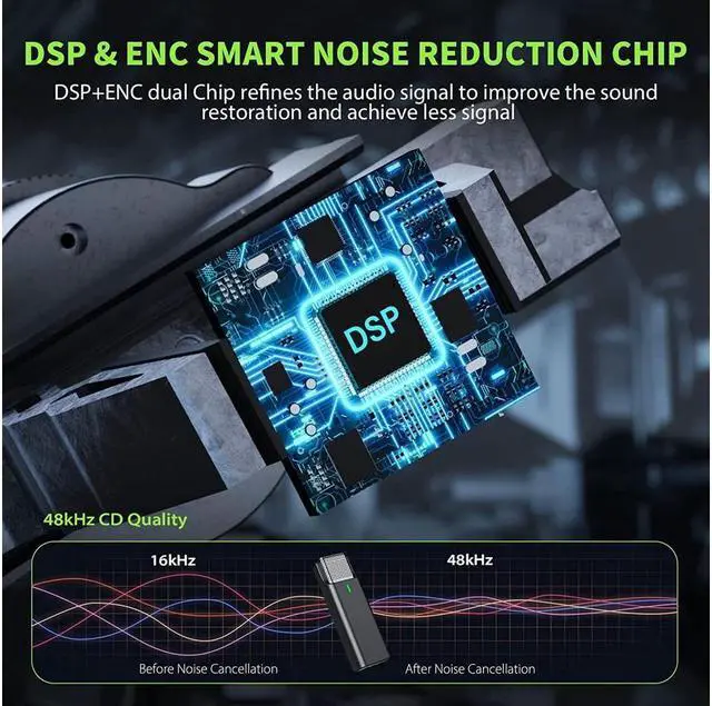 Crystal Clear Recording Wireless Lapel Microphone --- Using high-sensitivity digital silicon mic head for 360° omnidirectional pickup to capture more sound details. The built-in DSP intelligent noise reduction chip provides broadcast-level sound quality and can record clearly even in noisy environment. The ultra-low transmission delay of the mic is only 0.009s, it can provide professional full-band audio 48kHz stereo CD quality and supports multi-channel real-time mixing