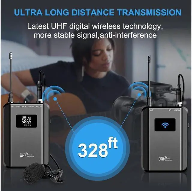 Professional Recording Quality---The wireless lavalier microphone adopt the latest UHF wireless technology provides a stronger signal , reducing the possibility of interference from Bluetooth or WiFi. --- Up to 328ft transmission range(in an open areal).