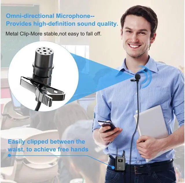 Wireless Lavalier Mic is Battry Powered---It requires a total of 4 AA batteries, can be used anywhere. --- Digital LED display, clearly showing frequency, power and volume, easier to use.(11 levels volume adjustable)