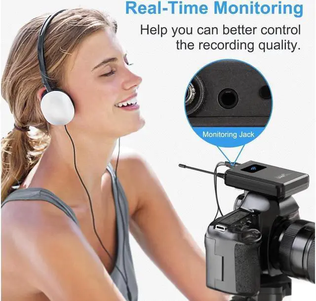 Ideal for Video Recording---Built-in high-sensitivity mic and noise reduction chip bring clearer sound quality. --- The receiver has a headphone monitoring jack, real-time monitoring, no delay, you can listen while recording, better control the sound quality.