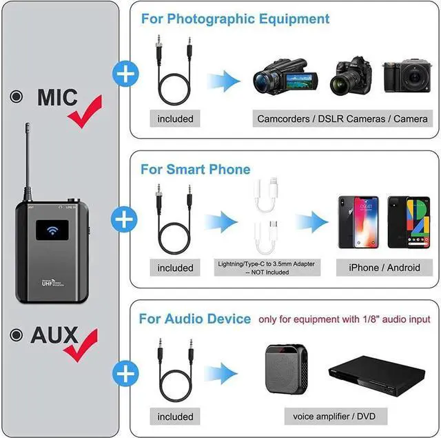 Universal System&Support Aux Jack---Our wireless lavalier microphone system are compatible with DSLR camera,camcorders,smartphones. --- And come with AUX audio cable for 1/8” audio input amplifier/mixer.