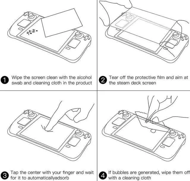 PACKING LIST --- 3 Pack ( 3 x Steam Deck Screen Protector, 1 x Wet Wipes + Dry Wipes, 2 x Guide Stickers, 1 x Dust-absorber, 1 x Gift Box with Instructions.