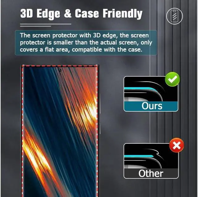 3D Curved Fit & Case Friendly --- This protector covers the rounded edges of the s23 ultra ,exquisitely polished, 2.5D rounded edges technique makes curved edges of the film to perfectly fit curved corners and edges of the phone, 1.4 mm margin around the edge of the device to be compatible with MOST cases. 99.9% ultra-clear high definition transparency, drop protection and full compatibility with touchscreen sensitivity.