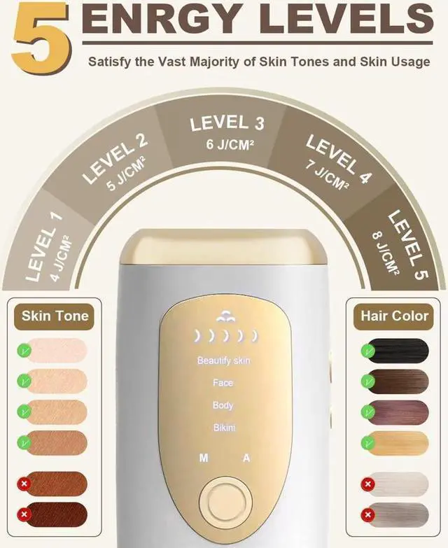 4 Different Modes & 5 Levels Energy: This laser hair removal device has 5 different strength levels, suitable for different skin sensitivity needs. It is recommended that first-time users start from the first level and gradually increase the level of use. We are equipped with four exclusive modes of Face, Bikini, Body, and Skin. You can use the corresponding mode according to the hair removal area to give you a more precise treatment
