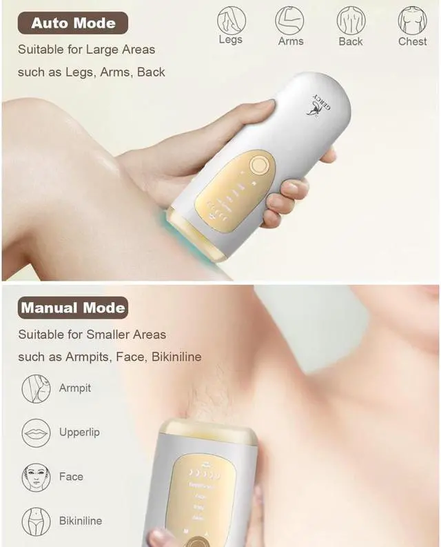 Easy to Use & Auto/ Manual Mode: The hair removal laser comes with manual and automatic modes, the default is manual mode, press and hold the flash button for 3 seconds to switch to automatic mode, manual mode is suitable for precise areas such as lips, fingers, armpits and bikini line. Auto mode is suitable for large areas such as arms, legs, abdomen, and back