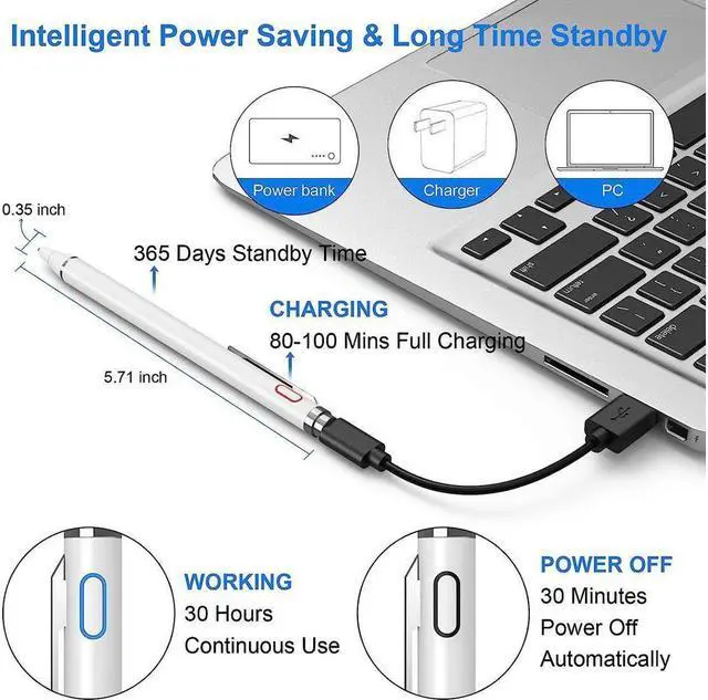 EASY TO USE & LONG STANDBY: You can use this iPad stylus without a Bluetooth connection. Just unpack the packaging, turn on the digital pen, and begin creating. With USB charge port and built-in battery provides 30 hours of active use after 80-100 minutes of full charging. Multi-charging ways within the wall charger, power bank, and computer. With the intelligent power-saving function, 30 minutes of automatic power off for safety.