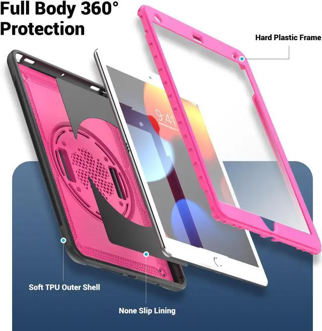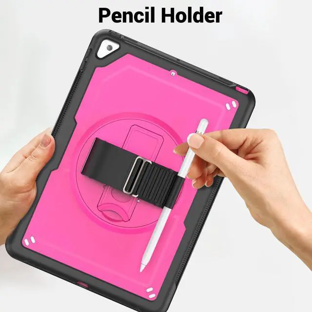 360° Rotatable Kickstand + Hand Strap: iPad Case, with 360° rotating Swivel & Sturdy stand, supports position of 3 angles (30°/45°/60°), allows to place iPad case according to needs. Come with an adjustable handle strap, can preventing falling or slipping.