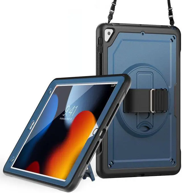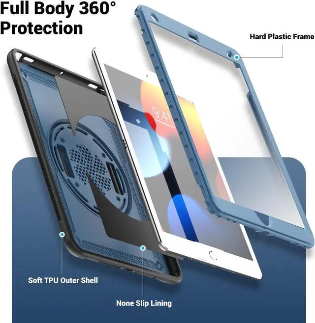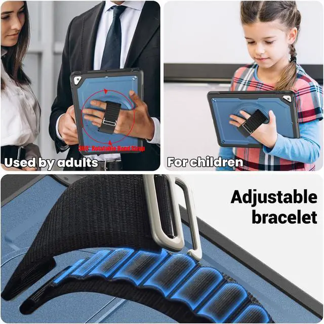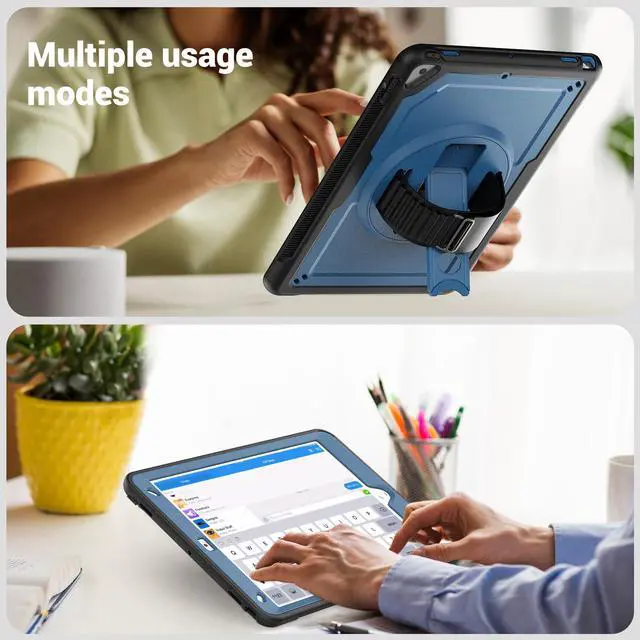 360° Rotatable Kickstand + Hand Strap: iPad Case, with 360° rotating Swivel & Sturdy stand, supports position of 3 angles (30°/45°/60°), allows to place iPad case according to needs. Come with an adjustable handle strap, can preventing falling or slipping.