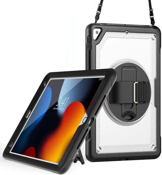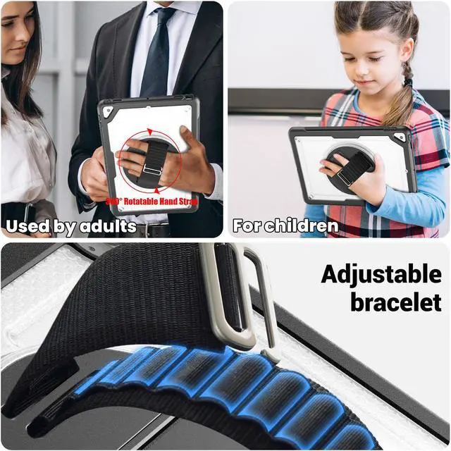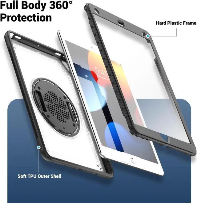 360° Rotatable Kickstand + Hand Strap: iPad Case, with 360° rotating Swivel & Sturdy stand, supports position of 3 angles (30°/45°/60°), allows to place iPad case according to needs. Come with an adjustable handle strap, can preventing falling or slipping.