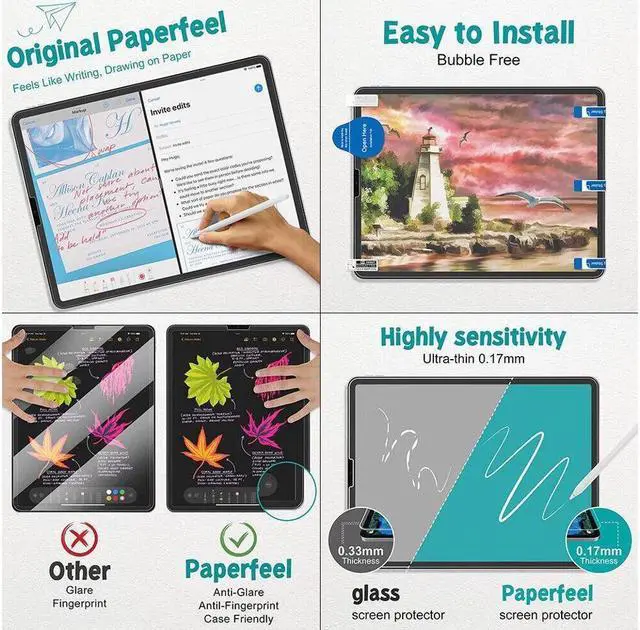 Including One Paperfeel Screen Protector: Touch-sensitive, matte surface, anti-fingerprint, anti-glare, ultra-thin and case-friendly, bubble-free, easy to install; The Paperfeel surface provides the touch and resistance of paper on a tablet for drawing or writing; Precise cutting will not affect your Face ID authorization.