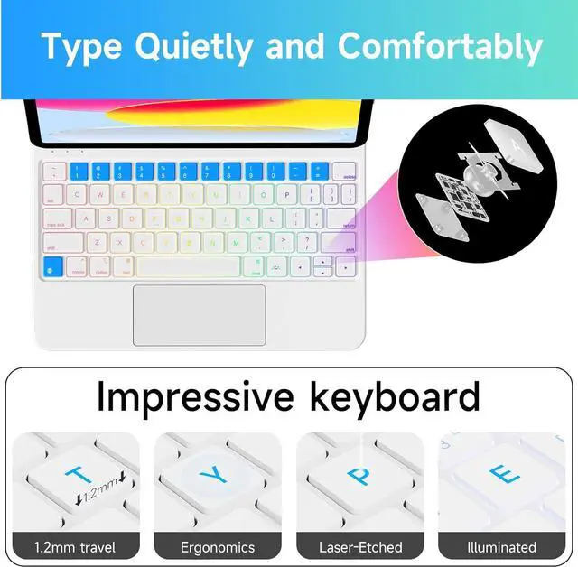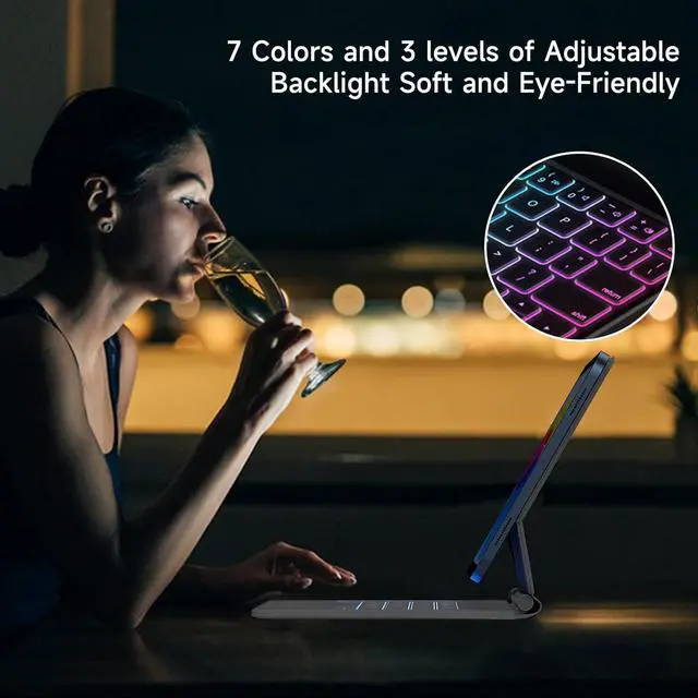 7 Colors & 3 Modes Eye-Friendly Backlit --- Illuminate your workspace with our 7-color backlit keyboard for ipad 10th generation. With 3 adjustable brightness levels, protect your eyesight while enjoying a personalized typing experience tailored to your environment.