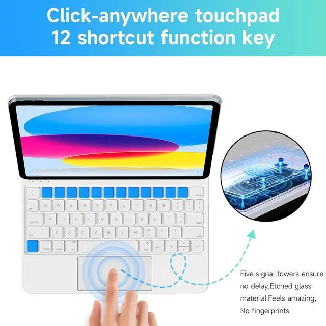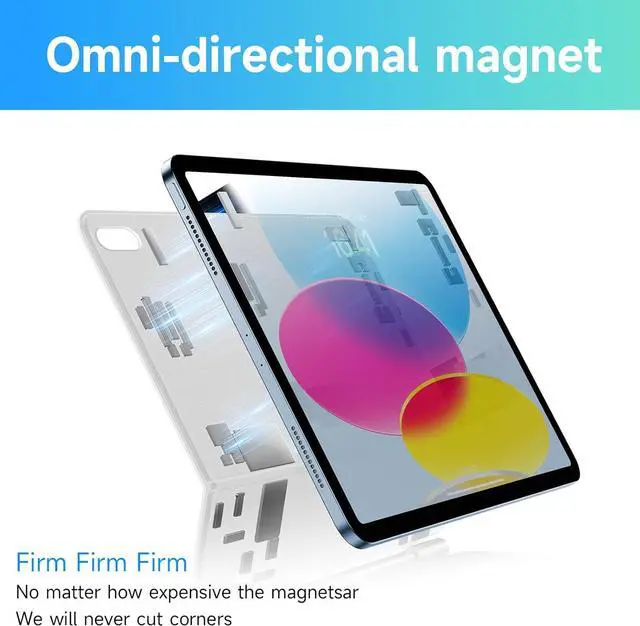 135° Adjustable Floating Magnetic Stand --- Find your perfect viewing angle with our 135° adjustable floating magnetic stand. Whether you're working, studying, or indulging in entertainment, our strong magnetic back panel ensures stability while exuding elegance. Floating design provides unobstructed viewing and allows direct visibility of power, caps lock, and Bluetooth indicators on iPad 10th keyboard.