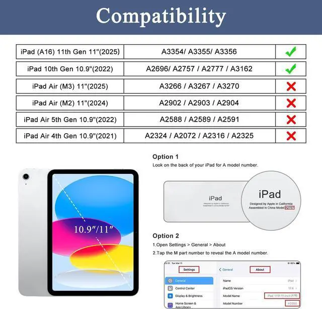 Compatibility --- Exclusively Compatible with iPad (A16) 11th generation 11 inch 2025 (Model: A3354, A3355, A3356) and iPad 10th Generation 10.9 inch 2022 ( model: A2757, A2777, A2696). Please verify your model number before purchase to ensure compatibility.