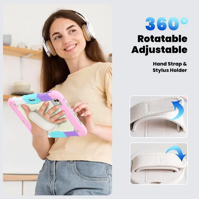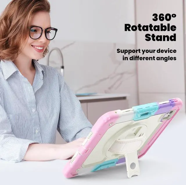 360° Swivel Stand and Hand Strap: Multi-functional stand supports multi-angle viewing, and the swivel hand strap prevents accidental drops, enhancing usability for a variety of users such as teachers, students, waiters, and conference presenters.