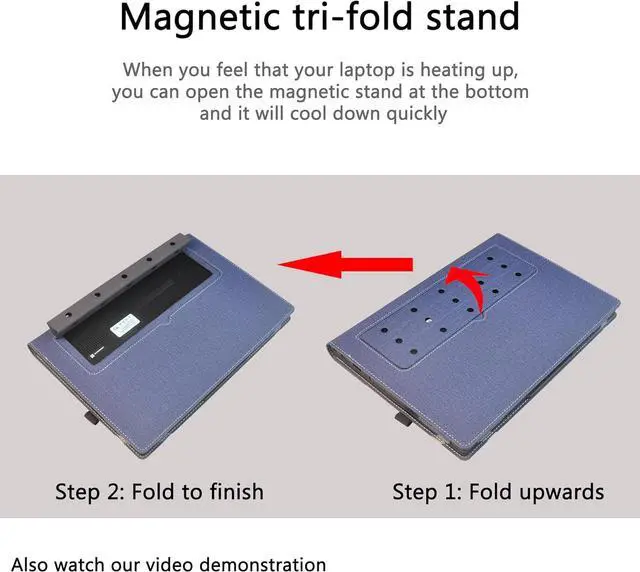 Heat dissipation design: the bottom with magnetic tri-fold stand can be opened when the laptop is hot, providing stable support while effectively dissipating heat.The way the bracket folds, you can refer to our video demonstration.