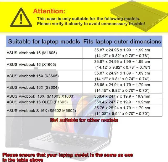 Fit models: only for 16 inch ASUS VivoBook 16X S3604 K3605 M1603 X1603&VivoBook 16 OLED F1603 X1605 M1605&Vivobook S 16X S5602 M5602. Does not fit any other model.Please check clearly.