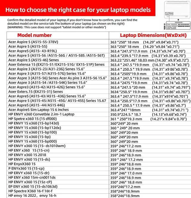 This PC case is compatible with HP Laptop - 15z 15t 15-dy series HP ENVY 15 x360 15-bp, 15-ds, 15-cn, 15-cp, 15-dr series; Acer Aspire 5 A515-55, A515-43, A515-56, A515-46, A515-45, A515-44 series, Aspire 3 A315-42, A315-54, A315-56, A315-57, A315-23 series; Extensa 15 EX215-31, EX215-51 series laptop. (excluding equipment)