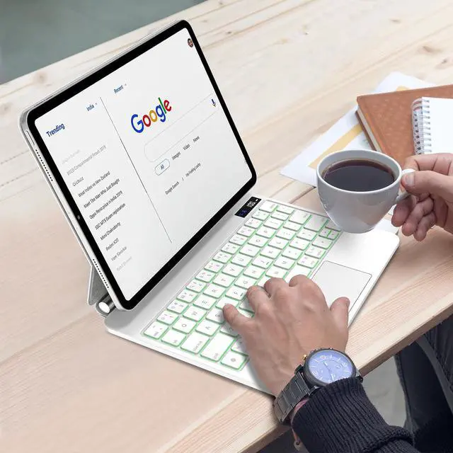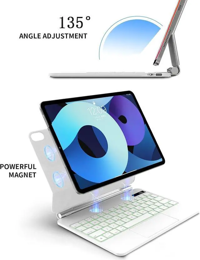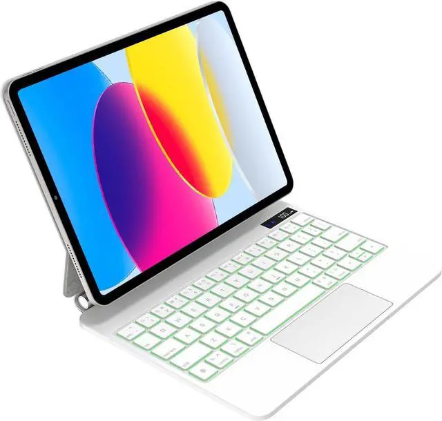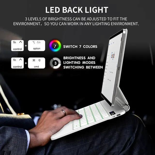 [LED Backlight & LCD Display]: iPad backlit keyboard comes in 7 colors, 3 brightness levels, and colorful breathing modes. The ipad 10th gen keyboard has an LCD that lets you check battery level, capital letters, and BT pairing status.