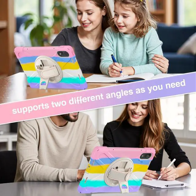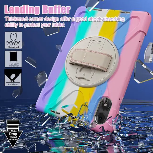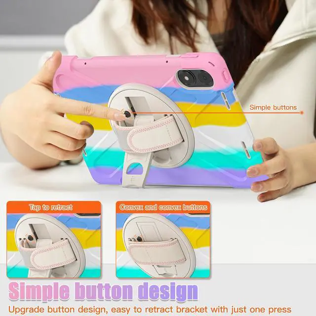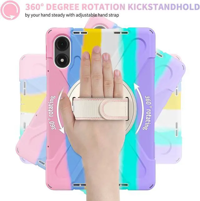 360° ROTATABLE STAND & HAND STRAP - 360° Rotatable foldable stand offers multiple angles for enjoying the most comfortable keyboard-typing, movie-viewing or draw. This sturdy kickstand can be folded when you don't need it. Ergonomically 360°Rotatable adjustable hand strap makes you hold or use your tablet easily in all directions, adjustable velcro hands strap allows big hand and small hand, perfect for kids and adults.